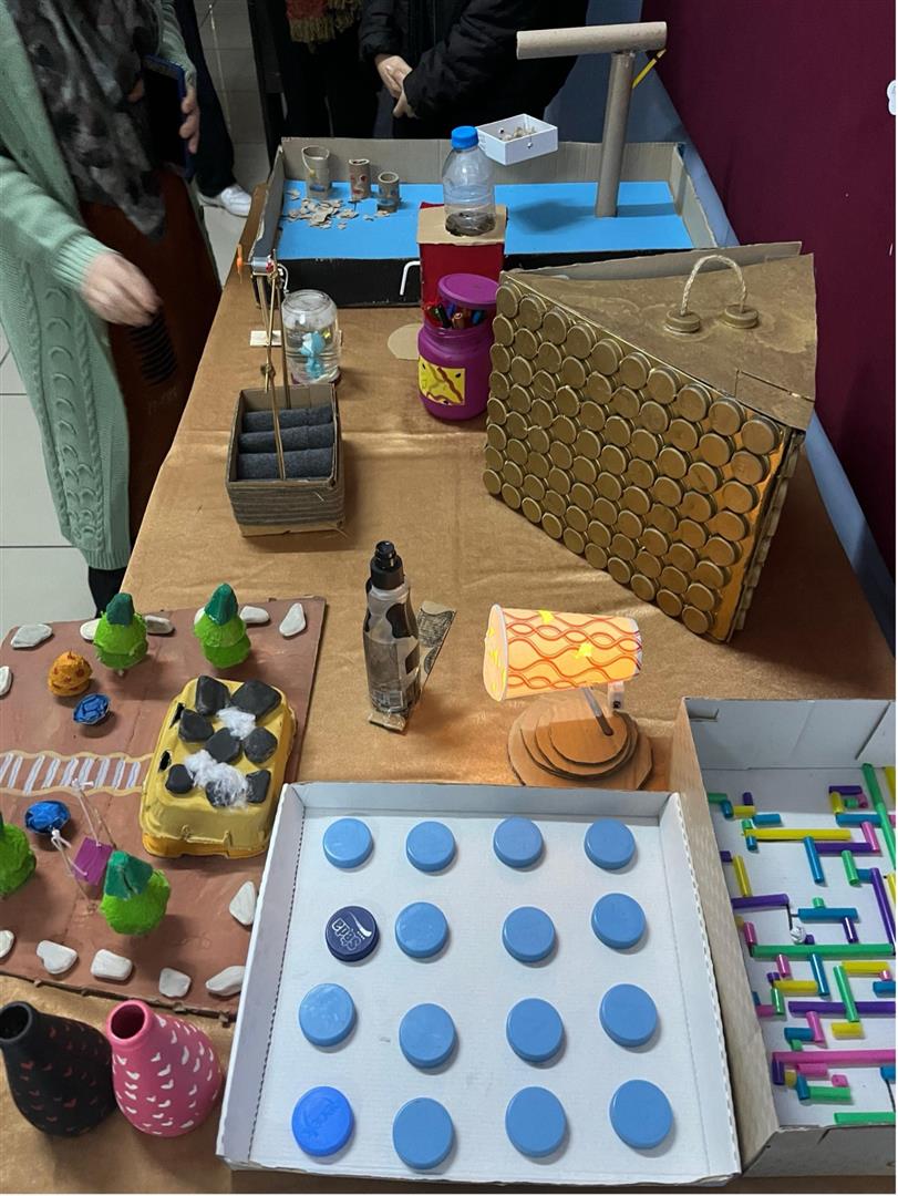 Sevim İfakat Demiray, Pınar Taştan ve Orhancan Sarsılmaz’ın aktif rol aldığı projede, meslek lisesi öğrencilerinde çevre bilinci ve geri dönüşüm farkındalığının artırılması hedeflendi. Proje sürecinde öğrencilerle birlikte geri dönüşüm fikirleri geliştirildi; karton, cam şişe, plastik şişe, kavanoz, kapak, karton bardak ve farklı ambalaj atıkları kullanılarak yaratıcı ürünler tasarlandı. Üretilen çalışmalar okul koridorunda sergilenerek geniş katılımlı bir farkındalık alanı oluşturuldu.